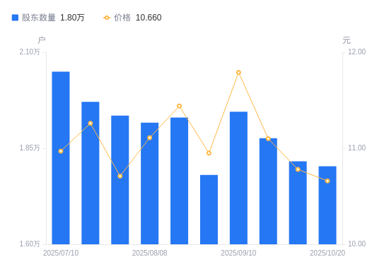 近一年(2024年10月31日至2025年10月20日),瑞丰高材A股股东户数从2.04万户,减低至1.8万户,降幅11.79%,区间股价上涨5.75%。