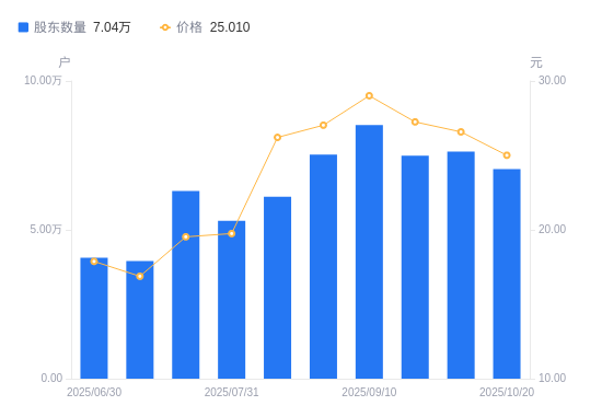 近一年(2024年11月8日至2025年10月20日),中欣氟材A股股东户数从2.5万户,增加至7.04万户,增幅181.49%,区间股价上涨119.77%。