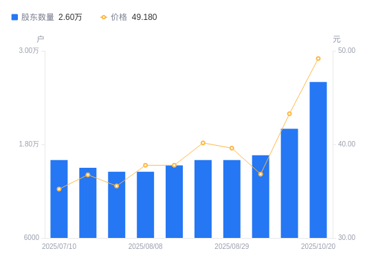 近一年(2024年12月31日至2025年10月20日),雅创电子A股股东户数从1.39万户,增加至2.6万户,增幅87.06%,区间股价上涨47.61%。
