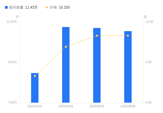 近一年(2024年9月30日至2025年9月30日),亚星锚链A股股东户数从9.42万户,增加至11.43万户,增幅21.35%,区间股价上涨40.58%。