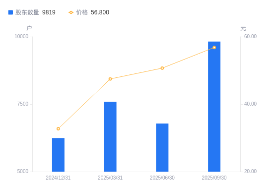 10月27日消息,数据显示,截至2025年9月30日,映翰通A股股东总户数为9819户,较上期(2025年6月30日)增加3034户,增幅44.72%。公司最新A股总股本为7365.61万股,其中流通A股7365.61万股,户均持有流通A股数量为7501.39股,较上期减少3383.19股,降幅31.08%;户均持流通A股市值42.61万元,较上期减少12.57万元,降幅22.78%。