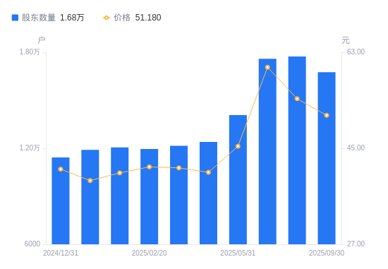 近一年(2024年9月30日至2025年9月30日),国科军工A股股东户数从8883户,增加至1.68万户,增幅88.64%,区间股价上涨58.45%。