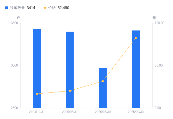 近一年(2024年9月30日至2025年9月30日),瑞晟智能A股股东户数从3403户,增加至3414户,增幅0.32%,区间股价上涨464.58%。