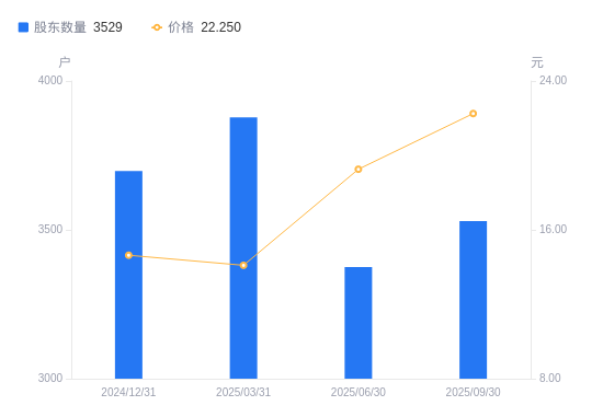 近一年(2024年9月30日至2025年9月30日),德林海A股股东户数从3781户,减低至3529户,降幅6.66%,区间股价上涨54.58%。