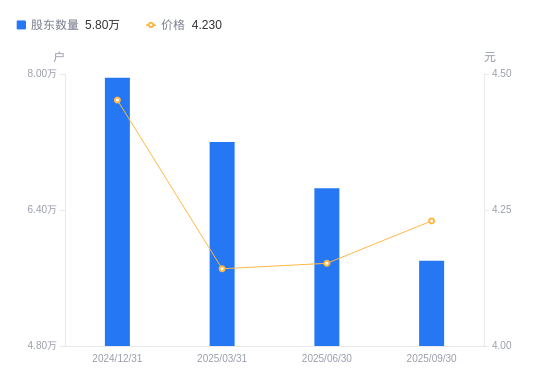 10月27日消息,数据显示,截至2025年9月30日,益民集团A股股东总户数为5.8万户,较上期(2025年6月30日)减少8536户,降幅12.82%。公司最新A股总股本为10.54亿股,其中流通A股10.54亿股,户均持有流通A股数量为1.82万股,较上期增加2328.79股,增幅14.71%;户均持流通A股市值7.68万元,较上期增加1.11万元,增幅16.86%。