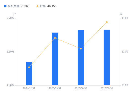 近一年(2024年9月30日至2025年9月30日),五洲新春A股股东户数从2.89万户,增加至7.23万户,增幅149.91%,区间股价上涨205.22%。