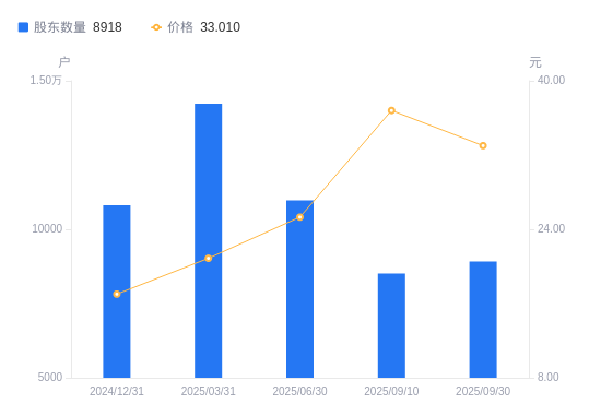 近一年(2024年9月30日至2025年9月30日),联合精密A股股东户数从1.17万户,减低至8918户,降幅23.99%,区间股价上涨102.47%。
