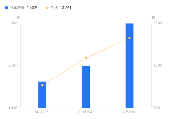 10月27日消息,数据显示,截至2025年9月30日,永茂泰A股股东总户数为1.76万户,较上期(2025年6月30日)减少6373户,降幅26.58%。公司最新A股总股本为3.3亿股,其中流通A股3.3亿股,户均持有流通A股数量为1.87万股,较上期增加4983.61股,增幅36.21%;户均持流通A股市值27万元,较上期增加8.74万元,增幅47.91%。