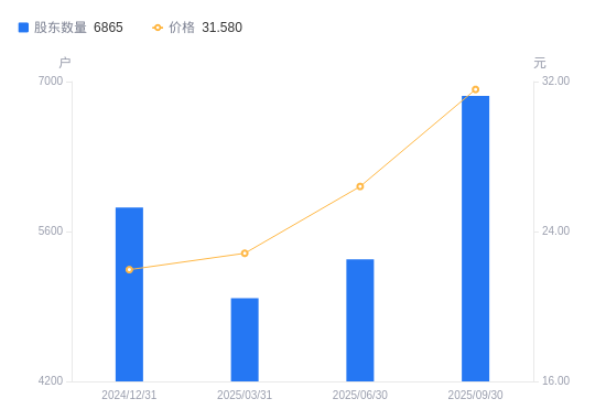 近一年(2024年9月30日至2025年9月30日),耐科装备A股股东户数从5496户,增加至6865户,增幅24.91%,区间股价上涨81.22%。