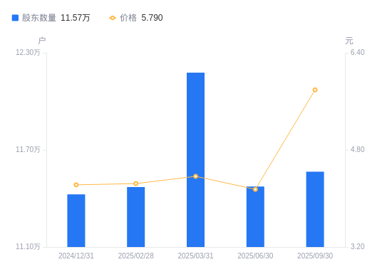 近一年(2024年9月30日至2025年9月30日),钛能化学A股股东户数从12.31万户,减低至11.57万户,降幅6.04%,区间股价上涨47.89%。