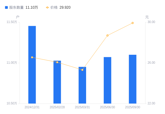 近一年(2024年9月30日至2025年9月30日),北斗星通A股股东户数从12.03万户,减低至11.1万户,降幅7.75%,区间股价上涨17.93%。
