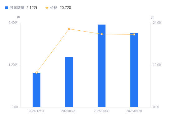 10月27日消息,数据显示,截至2025年9月30日,回盛生物A股股东总户数为2.12万户,较上期(2025年6月30日)减少2358户,降幅10.03%。公司最新A股总股本为2.02亿股,其中流通A股2.02亿股,户均持有流通A股数量为9566.55股,较上期增加959.59股,增幅11.15%;户均持流通A股市值19.82万元,较上期增加1.92万元,增幅10.72%。