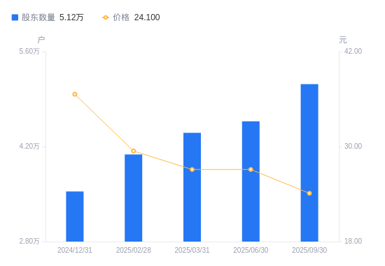 近一年(2024年9月30日至2025年9月30日),三只松鼠A股股东户数从3.53万户,增加至5.12万户,增幅45.29%,区间股价上涨12.93%。