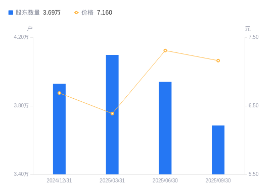 近一年(2024年9月30日至2025年9月30日),中牧股份A股股东户数从3.9万户,减低至3.69万户,降幅5.55%,区间股价上涨8.70%。