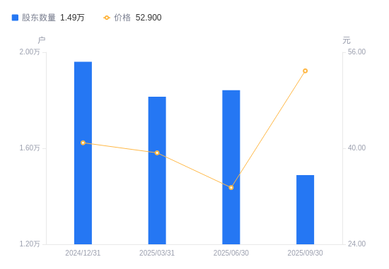 10月27日消息,数据显示,截至2025年9月30日,金盘科技A股股东总户数为1.49万户,较上期(2025年6月30日)减少3533户,降幅19.18%。公司最新A股总股本为4.6亿股,其中流通A股4.6亿股,户均持有流通A股数量为3.09万股,较上期增加5953.75股,增幅23.87%;户均持流通A股市值163.43万元,较上期增加80万元,增幅95.90%。