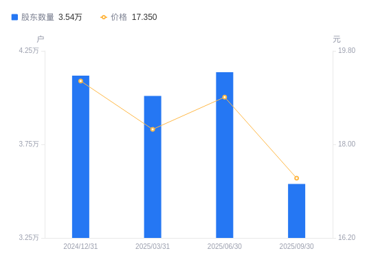 近一年(2024年9月30日至2025年9月30日),捷荣技术A股股东户数从4.49万户,减低至3.54万户,降幅21.17%,区间股价下跌12.90%。