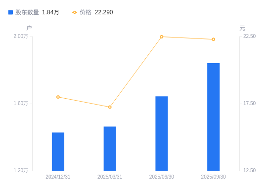 10月27日消息,数据显示,截至2025年9月30日,北方股份A股股东总户数为1.84万户,较上期(2025年6月30日)增加1980户,增幅12.05%。公司最新A股总股本为1.7亿股,其中流通A股1.7亿股,户均持有流通A股数量为9232.61股,较上期减少1112.43股,降幅10.75%;户均持流通A股市值20.58万元,较上期减少2.68万元,降幅11.52%。