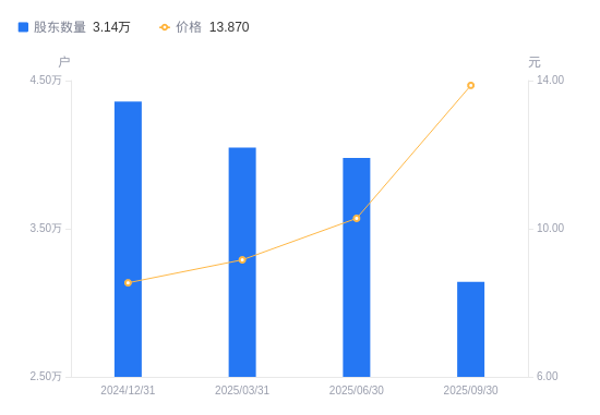 近一年(2024年9月30日至2025年9月30日),大恒科技A股股东户数从3.58万户,减低至3.14万户,降幅12.33%,区间股价上涨74.03%。