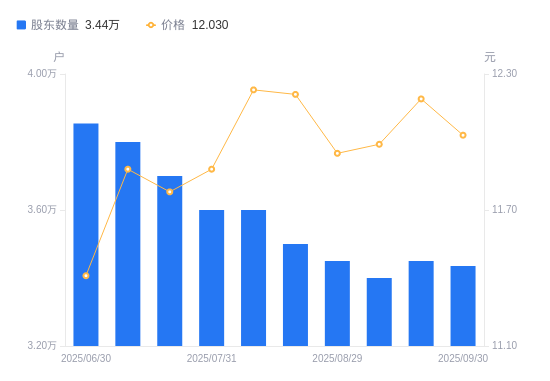 近一年(2024年9月30日至2025年9月30日),上海能源A股股东户数从3.91万户,减低至3.44万户,降幅12.10%,区间股价下跌7.53%。
