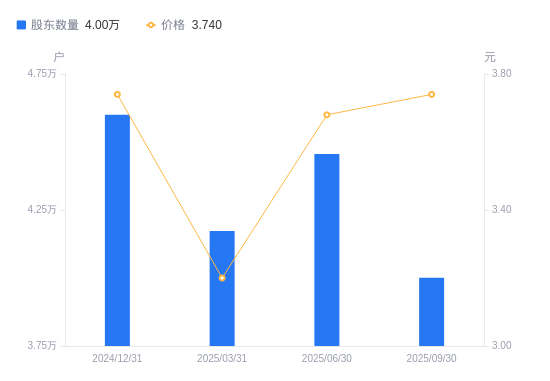 近一年(2024年9月30日至2025年9月30日),云煤能源A股股东户数从4.38万户,减低至4万户,降幅8.72%,区间股价上涨11.31%。