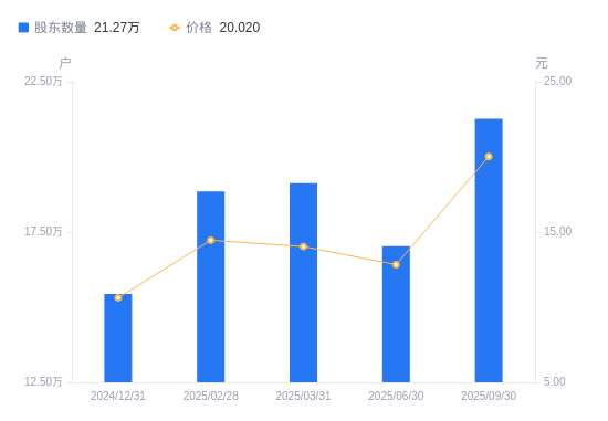 10月27日消息,数据显示,截至2025年9月30日,蔚蓝锂芯A股股东总户数为21.27万户,较上期(2025年6月30日)增加4.24万户,增幅24.87%。公司最新A股总股本为11.54亿股,其中流通A股10.85亿股,户均持有流通A股数量为5101.33股,较上期减少1268.61股,降幅19.92%;户均持流通A股市值10.21万元,较上期增加2.04万元,增幅24.96%。