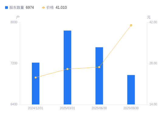 10月27日消息,数据显示,截至2025年9月30日,威迈斯A股股东总户数为6974户,较上期(2025年6月30日)减少541户,降幅7.20%。公司最新A股总股本为4.21亿股,其中流通A股2.54亿股,户均持有流通A股数量为3.65万股,较上期增加2677.76股,增幅7.92%;户均持流通A股市值149.55万元,较上期增加59.2万元,增幅65.52%。