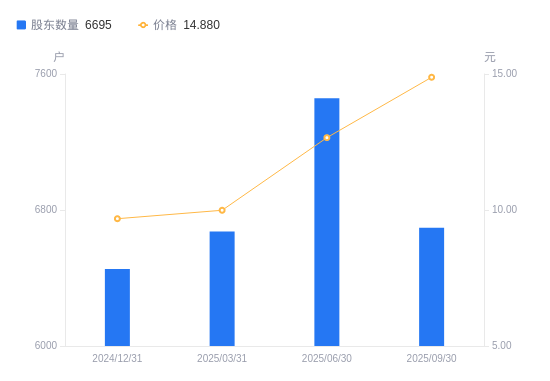 近一年(2024年9月30日至2025年9月30日),海正生材A股股东户数从7004户,减低至6695户,降幅4.41%,区间股价上涨68.33%。