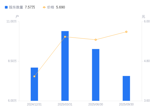 近一年(2024年9月30日至2025年9月30日),宁波建工A股股东户数从7.64万户,减低至7.57万户,降幅0.87%,区间股价上涨55.46%。