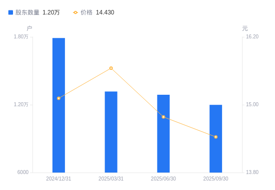10月27日消息,数据显示,截至2025年9月30日,米奥会展A股股东总户数为1.2万户,较上期(2025年6月30日)减少900户,降幅6.98%。公司最新A股总股本为2.99亿股,其中流通A股1.73亿股,户均持有流通A股数量为1.45万股,较上期增加1009.63股,增幅7.51%;户均持流通A股市值20.86万元,较上期增加9809.05元,增幅4.93%。