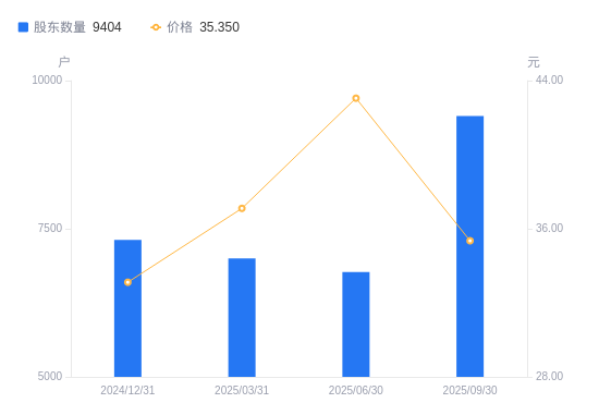 近一年(2024年9月30日至2025年9月30日),盟升电子A股股东户数从8591户,增加至9404户,增幅9.46%,区间股价上涨65.19%。