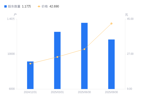 10月27日消息,数据显示,截至2025年9月30日,云中马A股股东总户数为1.17万户,较上期(2025年6月30日)减少1905户,降幅14.04%。公司最新A股总股本为1.38亿股,其中流通A股5106.35万股,户均持有流通A股数量为4378.62股,较上期增加614.82股,增幅16.34%;户均持流通A股市值18.69万元,较上期增加7.59万元,增幅68.29%。