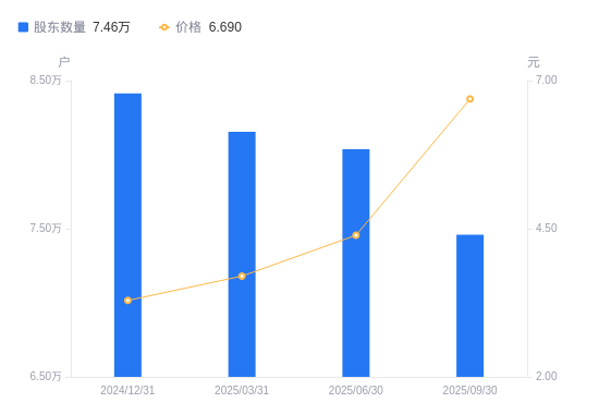近一年(2024年9月30日至2025年9月30日),鹏欣资源A股股东户数从10.21万户,减低至7.46万户,降幅26.96%,区间股价上涨122.26%。