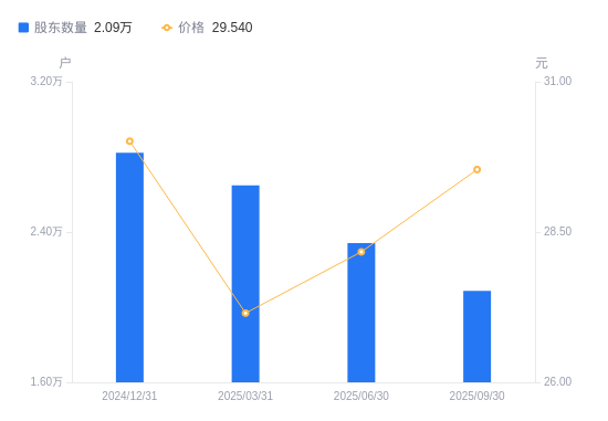 近一年(2024年9月30日至2025年9月30日),盘龙药业A股股东户数从2.42万户,减低至2.09万户,降幅13.78%,区间股价上涨15.84%。