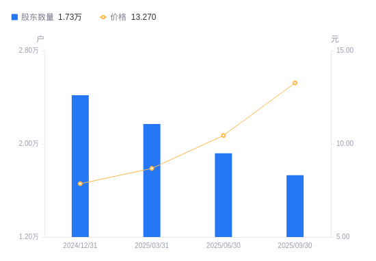 近一年(2024年9月30日至2025年9月30日),运达科技A股股东户数从2.1万户,减低至1.73万户,降幅17.76%,区间股价上涨133.92%。