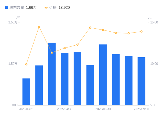 近一年(2024年9月30日至2025年9月30日),天顺股份A股股东户数从1.16万户,增加至1.66万户,增幅43.75%,区间股价上涨34.49%。
