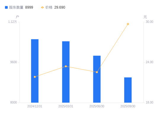 近一年(2024年9月30日至2025年9月30日),金钟股份A股股东户数从1.19万户,减低至8999户,降幅24.26%,区间股价上涨42.19%。