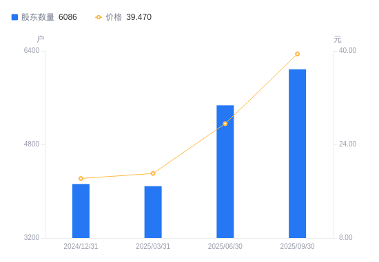 近一年(2024年9月30日至2025年9月30日),博力威A股股东户数从4432户,增加至6086户,增幅37.32%,区间股价上涨153.01%。