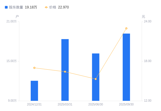 近一年(2024年9月30日至2025年9月30日),亨通光电A股股东户数从12.56万户,增加至19.18万户,增幅52.70%,区间股价上涨49.84%。