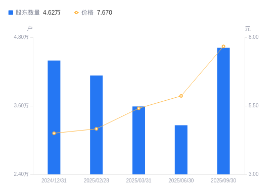 近一年(2024年9月30日至2025年9月30日),金字火腿A股股东户数从3.74万户,增加至4.62万户,增幅23.41%,区间股价上涨71.59%。