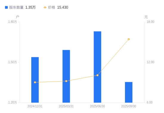 近一年(2024年9月30日至2025年9月30日),开山股份A股股东户数从1.61万户,减低至1.35万户,降幅16.03%,区间股价上涨82.60%。