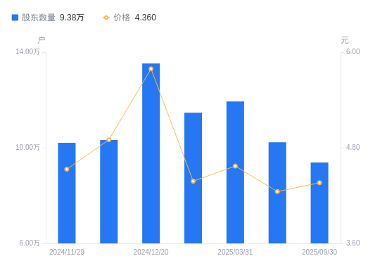 近一年(2024年9月30日至2025年9月30日),星星科技A股股东户数从7.26万户,增加至9.38万户,增幅29.34%,区间股价上涨63.91%。