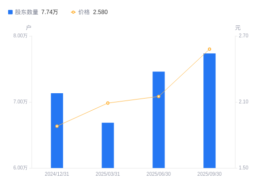 10月27日消息,数据显示,截至2025年9月30日,东方园林(维权)A股股东总户数为7.74万户,较上期(2025年6月30日)增加2751户,增幅3.69%。公司最新A股总股本为59.99亿股,其中流通A股41.99亿股,户均持有流通A股数量为5.43万股,较上期减少2001.72股,降幅3.56%;户均持流通A股市值14.01万元,较上期增加1.9万元,增幅15.73%。