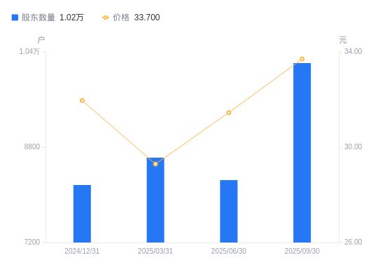 近一年(2024年9月30日至2025年9月30日),华恒生物A股股东户数从7426户,增加至1.02万户,增幅37.53%,区间股价上涨1.35%。