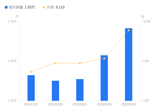近一年(2024年9月30日至2025年9月30日),盟科药业A股股东户数从1.31万户,增加至1.65万户,增幅25.74%,区间股价上涨112.35%。