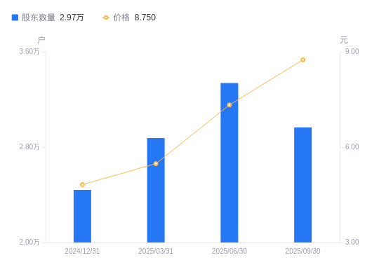 近一年(2024年9月30日至2025年9月30日),华升股份A股股东户数从2.84万户,增加至2.97万户,增幅4.31%,区间股价上涨112.90%。