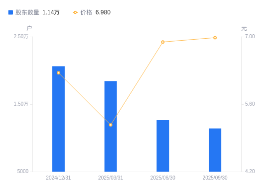 近一年(2024年9月30日至2025年9月30日),*ST海钦A股股东户数从2.01万户,减低至1.14万户,降幅43.26%,区间股价上涨17.51%。