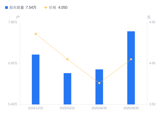 10月27日消息,数据显示,截至2025年9月30日,报喜鸟A股股东总户数为7.54万户,较上期(2025年6月30日)增加1.11万户,增幅17.31%。公司最新A股总股本为14.59亿股,其中流通A股11.8亿股,户均持有流通A股数量为1.57万股,较上期减少2710.31股,降幅14.76%;户均持流通A股市值6.34万元,较上期减少5651.13元,降幅8.18%。