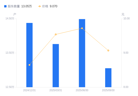 近一年(2024年9月30日至2025年9月30日),奥飞娱乐A股股东户数从12.54万户,增加至13.05万户,增幅4.12%,区间股价上涨47.48%。