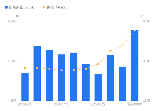 10月27日消息,数据显示,截至2025年9月30日,大金重工A股股东总户数为5.35万户,较上期(2025年9月19日)增加2573户,增幅5.06%。公司最新A股总股本为6.38亿股,其中流通A股6.31亿股,户均持有流通A股数量为1.18万股,较上期减少596.66股,降幅4.81%;户均持流通A股市值55.71万元,较上期增加2.22万元,增幅4.14%。