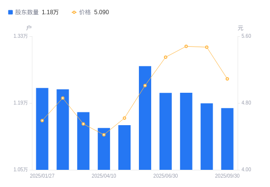 近一年(2024年9月30日至2025年9月30日),雪浪环境A股股东户数从1.23万户,减低至1.18万户,降幅4.46%,区间股价上涨29.19%。